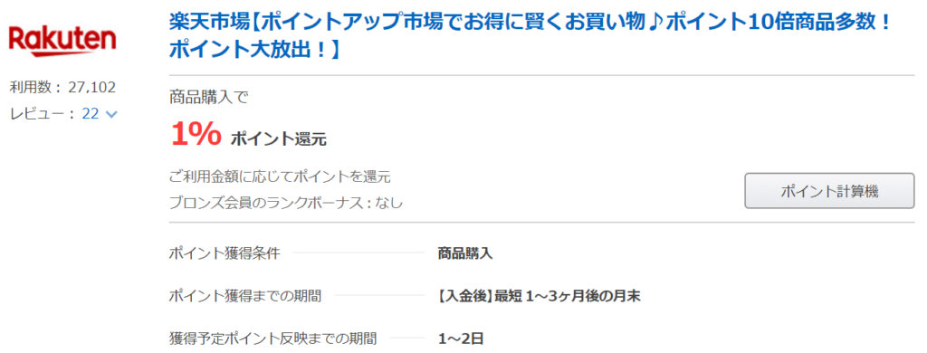 こちらは楽天市場をポイントタウンを経由して買い物をすると1%貰えます。