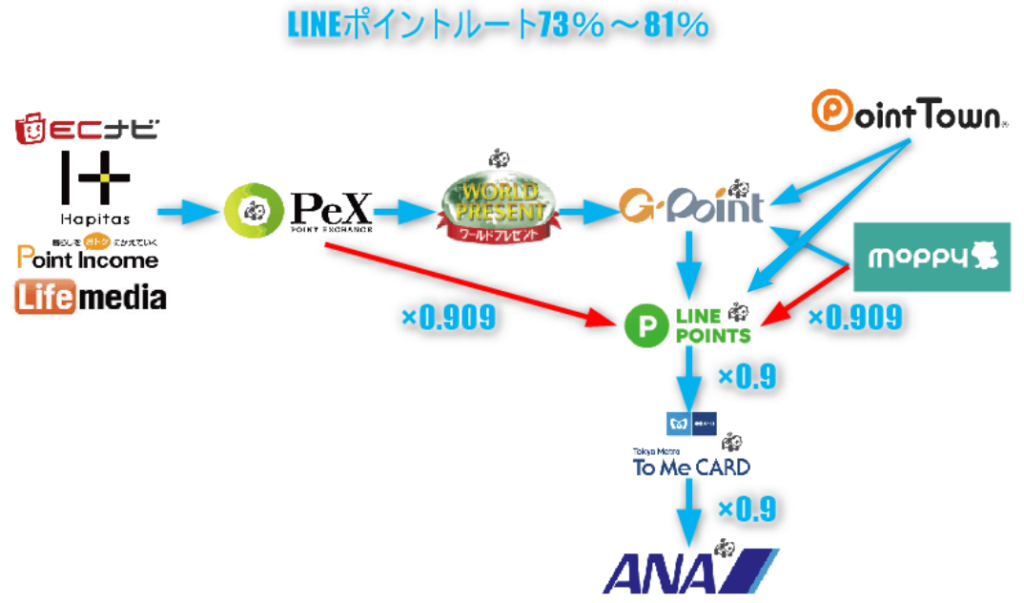 上記図解は各種ポイントサイトのLINEポイントルートとなります。
