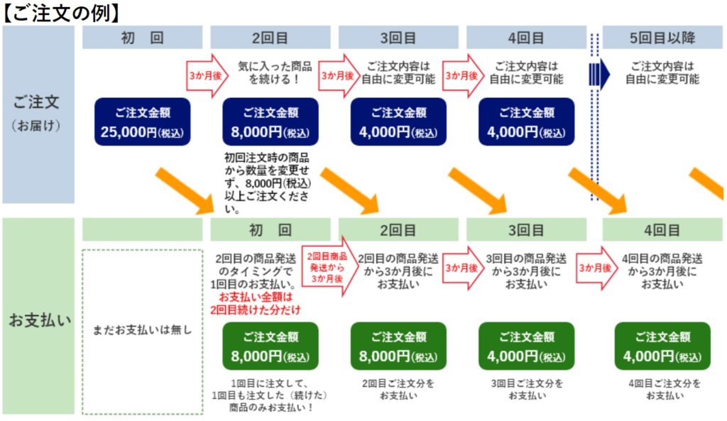 2回目の注文ですが「2回目の購入時は1回目に注文された商品の中から〇〇〇製品を最低8,000円以上ご注文」が必要!