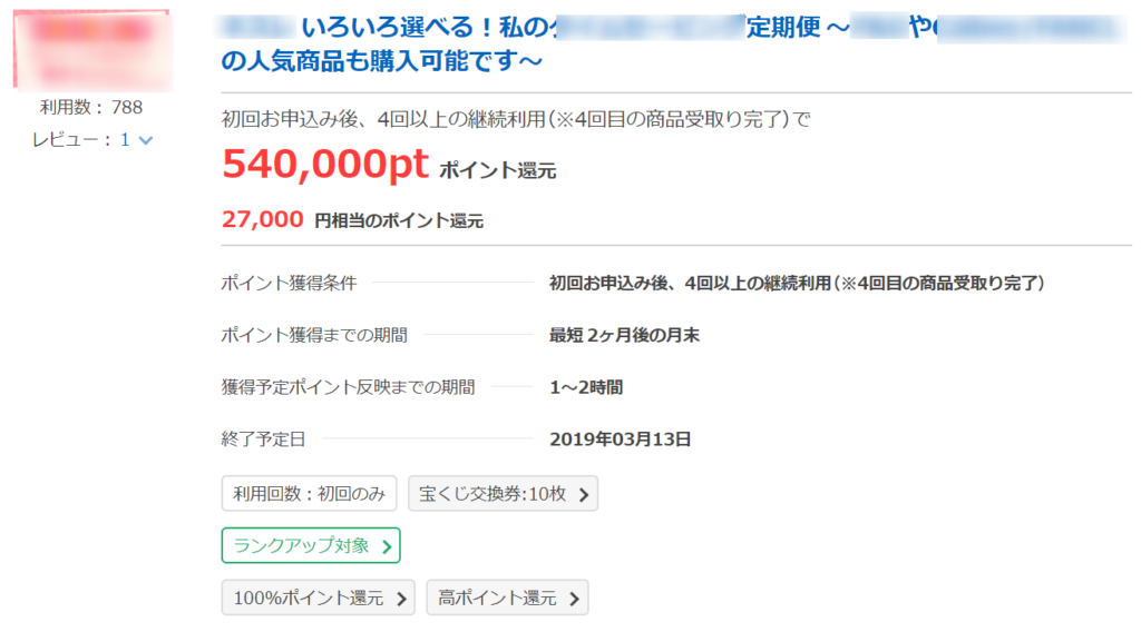 広告クリック後の遷移先ページ)からの本キャンペーン「定期便」を初回お申込み後、4回以上の継続利用(※4回目の商品受取り完了)でポイント獲得対象です。