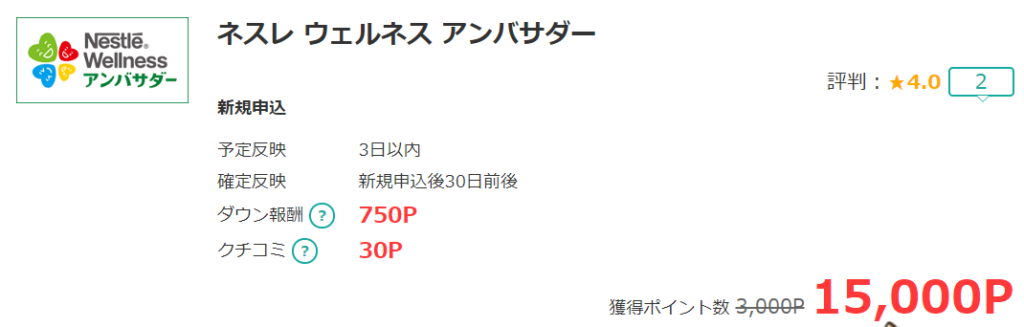 このネスレ案件につきましては、広告の内容を理解しようとしても自分では確実に理解しきれない事が多いです。と言うのも、どの製品をどれだけの量(個数)、どれだけの回数継続、どれだけの金額を購入したら良いのか?把握する必要があります。また案件数も多いため、条件がごっちゃになったり、リピートOKなのかどうか?本来はミスをしないためにも直接スポンサーで確認したいところですが、どの案件も共通して「直接スポンサーにポイントに関する問い合わせが不可で、発覚した場合、如何なる場合もポイント付与対象外」となるため、確認が出来ず利用するのが億劫になり、結局高ポイントなのに利用できずに終了してしまうパターンです。今回はお陰さまで前から疑問に思っていた案件が、非常に分かりやすく解説されているため十分理解もでき、これなら怖がらずに広告利用が出来そうです。一撃だけで15,000ポイントは大きいですね。