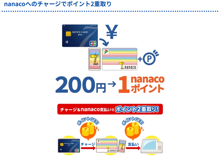 そのnanacoへのチャージでこちらのセブンカード・プラスを利用すると同じように200円で1ポイントが貰えるのでポイントの2重取りができるようになっていますよ!