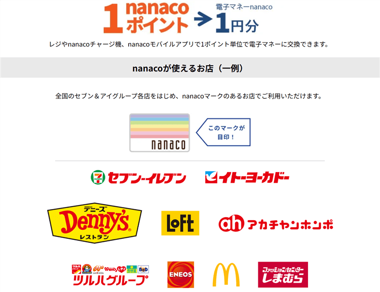 電子マネーnanacoに交換して、いろいろなお店の支払いに使える