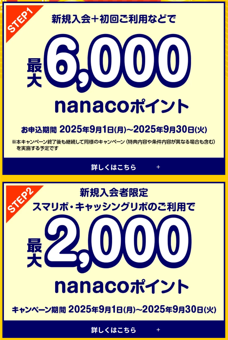 - 入会申込時にスマリボ(登録型リボ払いサービス)に設定・登録いただいた方に、もれなく2,000nanacoポイント