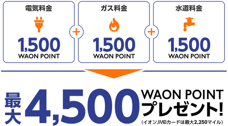 こちらは新規で公共料金の支払いをイオンカードで支払う事で最大4,500WAON POINTが貰えちゃいますよ!