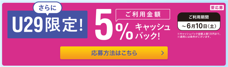 発行されたカードでのカード払いご利用分の5%をキャッシュバックいたします(キャッシュバック金額上限10,000円まで)。※キャンペーンのエントリーが必要です。