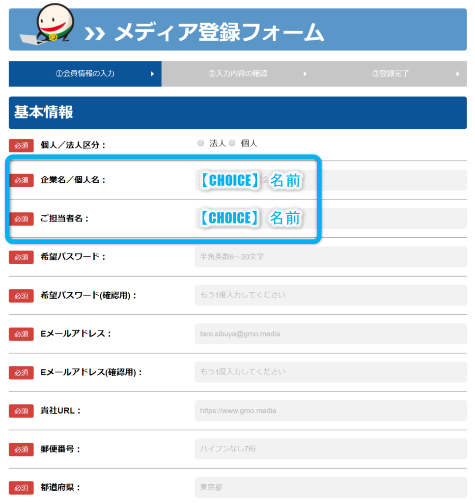 企業名/個人名、ご担当者名の冒頭に【CHOICE】を付けるようにしてください。