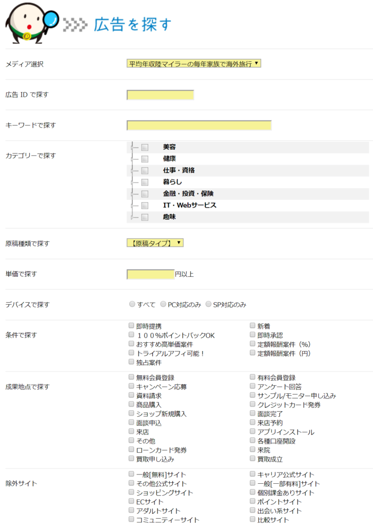 例えば、トライアルアフィ(セルフバック)の広告をピンポイントで探したい場合はその部分をチェックして検索するだけでOKです。