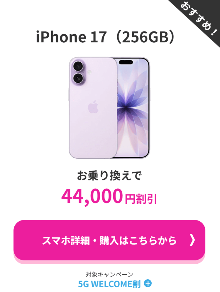 iPhone17(256GB)であれば44,000円の割引が適用されるようになっています。