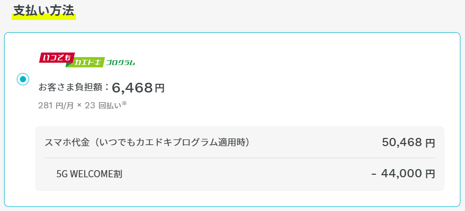 手順2:いつでもカエドキプログラムで更に月額費用節約!「5G WELCOME割」併用でiPhone17(256GB)が月々281円!!