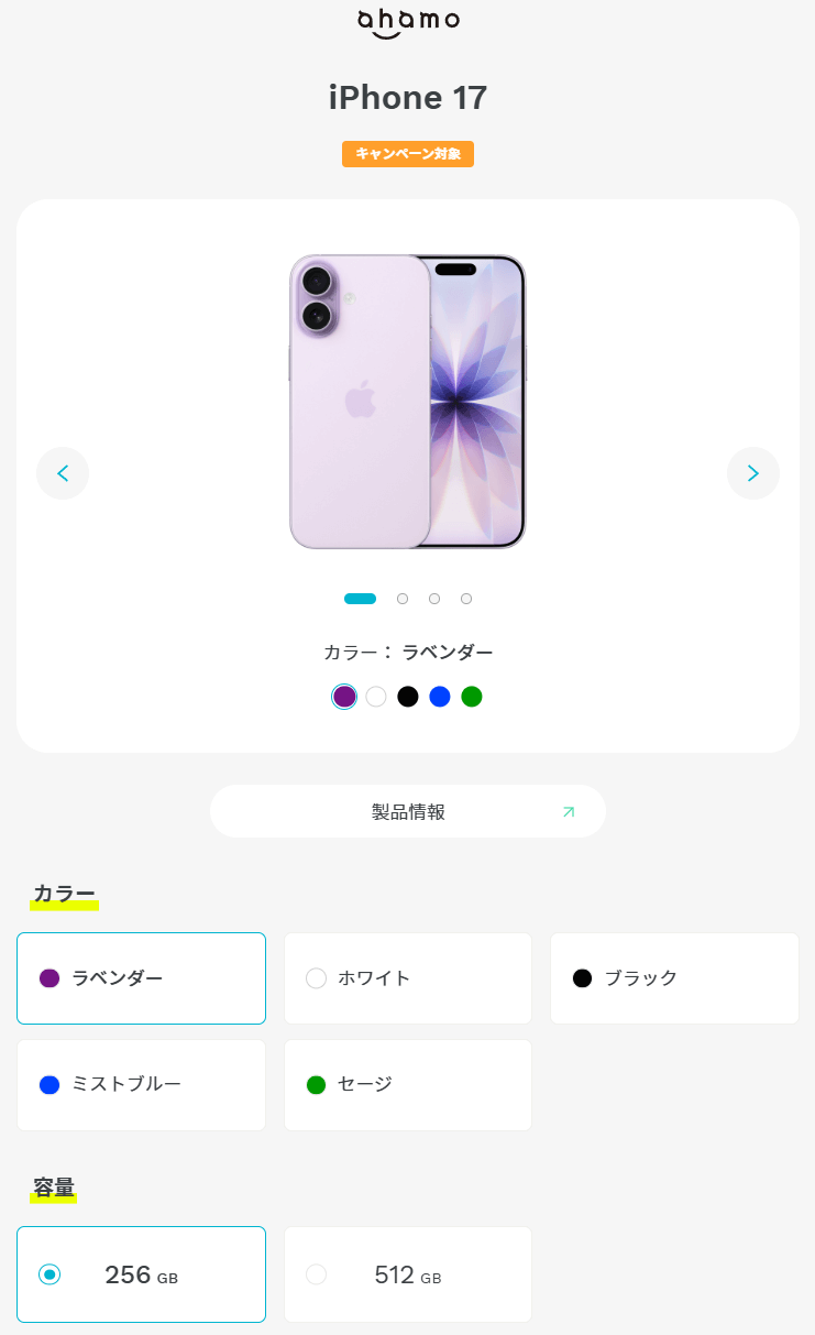 iPhone17を選択するとカラーや容量が選べるようになっています。