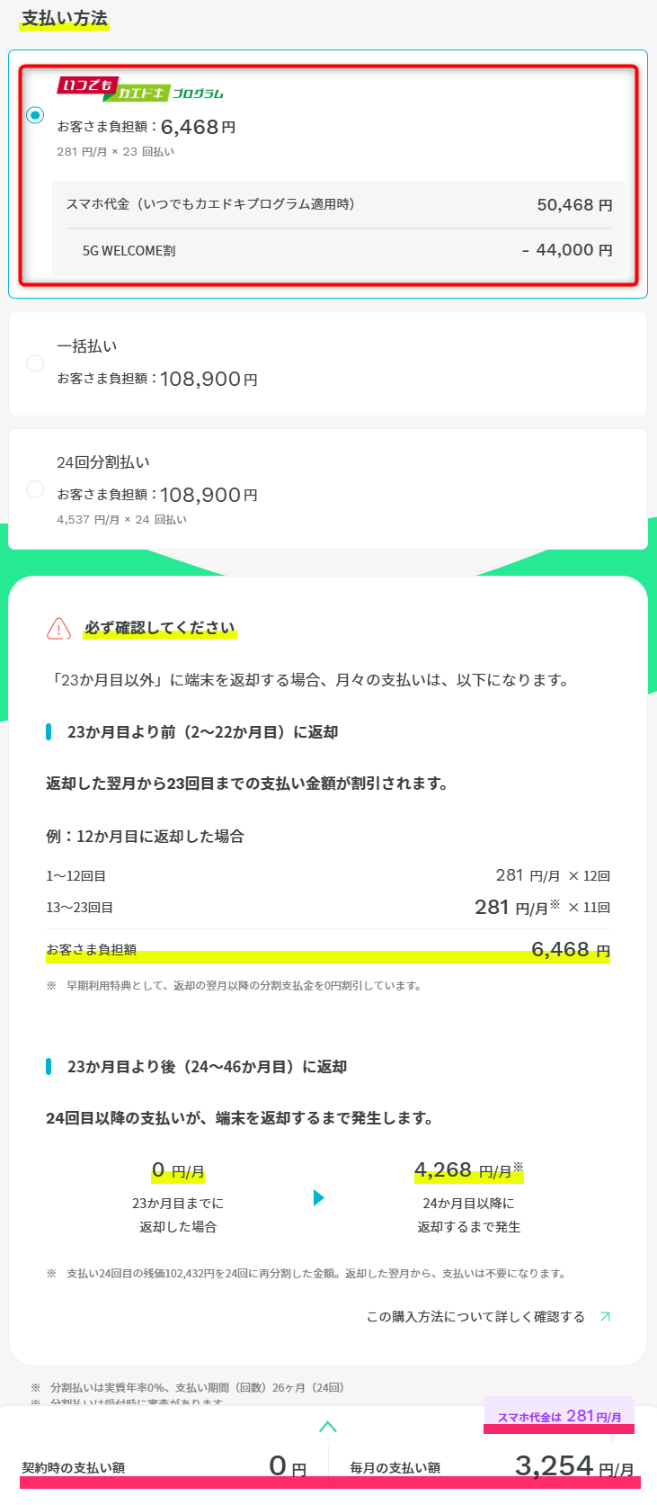 残価設定型24回分割払いでご購入して、23か月目に端末返却することで残りの残価の支払いをしなくても良いプログラムなんですよね。