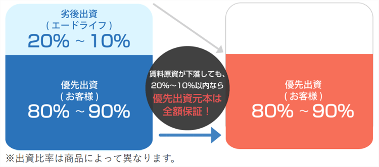優先劣後システムとは、出資いただいたお客様を「優先出資者」、事業者である当社を「劣後出資者」と定め、元本の償還および分配金の支払いを優先出資者から優先的に行い、優先出資者の元本および分配金の安全性を高める仕組みです。