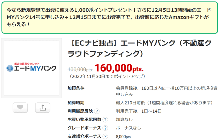 【ECナビ独占!】エードMYバンク(不動産クラウドファンディング)利用で160,000ポイントの爆益チャンス!