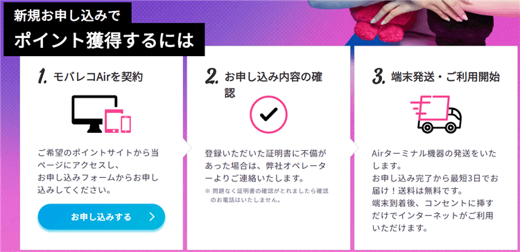 広告サイトへアクセス→お申込みをクリック→必要事項を入力→入力内容の確認→申し込み完了→端末受け取り→開通→新規申し込み後の開通完了!【お問合せについての注意事項】