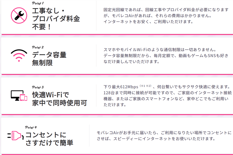 面倒な工事も不要で、手元にモバレコAirが届いたら後はこれをコンセントに刺して利用するだけでOK!