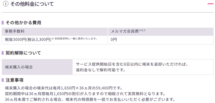 端末購入の場合の端末代は毎月1,650円×36ヵ月の59,400円です。