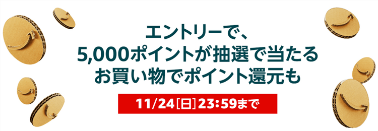 ※Amazonアカウントでキャンペーンページを見てエントリーされた方の中から、抽選で5,000ポイントが5,000名に、100ポイントが125,000名に当たります。●キャンペーンエントリー期間: 2019年11月15日[金]12:00 - 11月24日[日]23:59