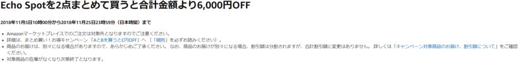 こちらは「Echo Spot」を2つまとめて購入で6,000円OFFとなります。