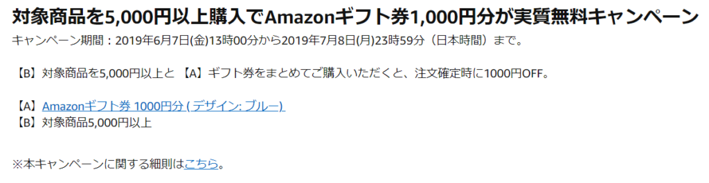 こちらはAmazonギフト券を5,000円以上購入すると、注文確定時に1,000円OFFとなります!!