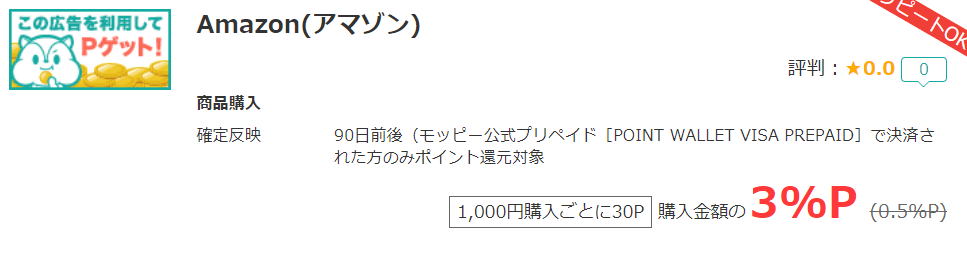 そして「POINT WALLET VISA PREPAID」利用なので3%モッピーポイントが貰えます。