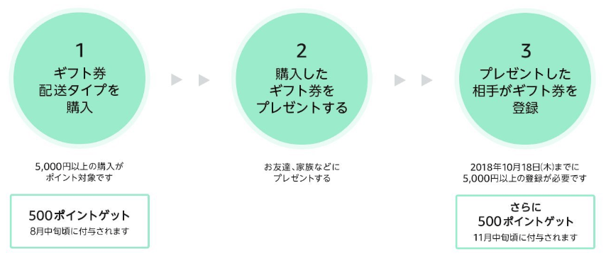 ステップ1で購入したギフト券(配送タイプ)をプレゼントしたい人に送って、その方が5,000円以上の登録をしたら追加で500ポイントが貰えます。
