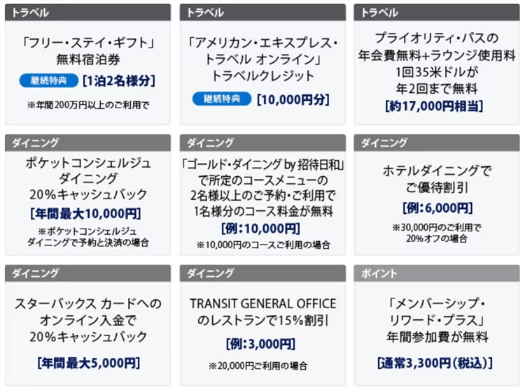 | トラベルクレジット | カード更新時にアメックストラベルオンラインの1万円分クレジット |