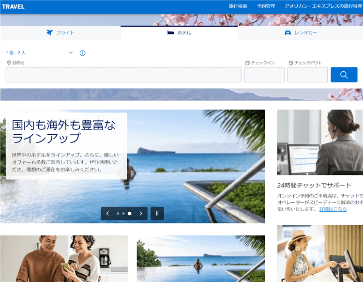 アメリカン・エキスプレス・トラベル オンラインから事前カード決済で、ホテル、レンタカー、国内航空券をご予約いただいた場合のみ適用されます。