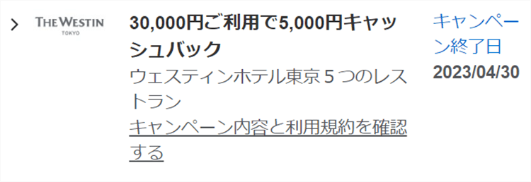 例えばウェスティン東京のレストラン利用で5,000円キャッシュバック。