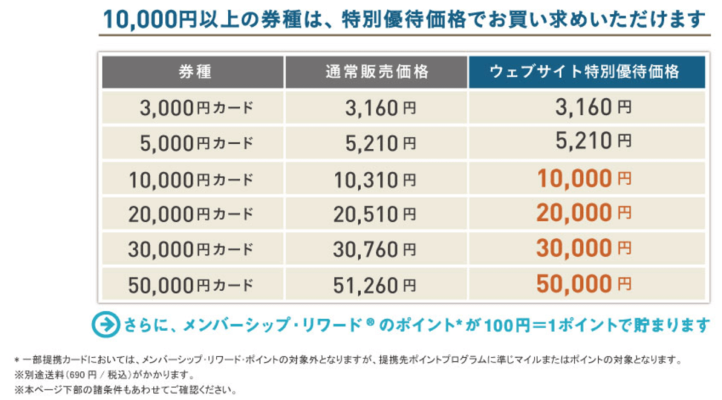 全部で6種類あります。10,000円以上のカードから優待価格となりますので、購入を検討されるのであれば、10,000円以上のカードがお得となります!