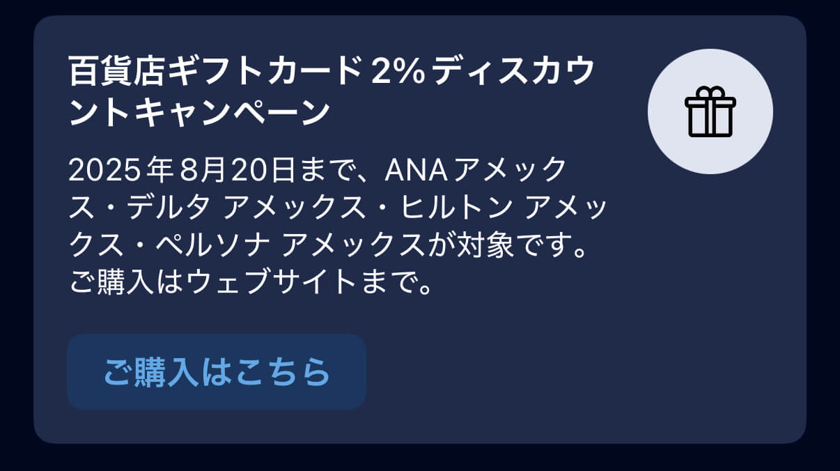 2025/5最新!2%オフでアメックス百貨店ギフトが購入できるキャンペーン!【終了】