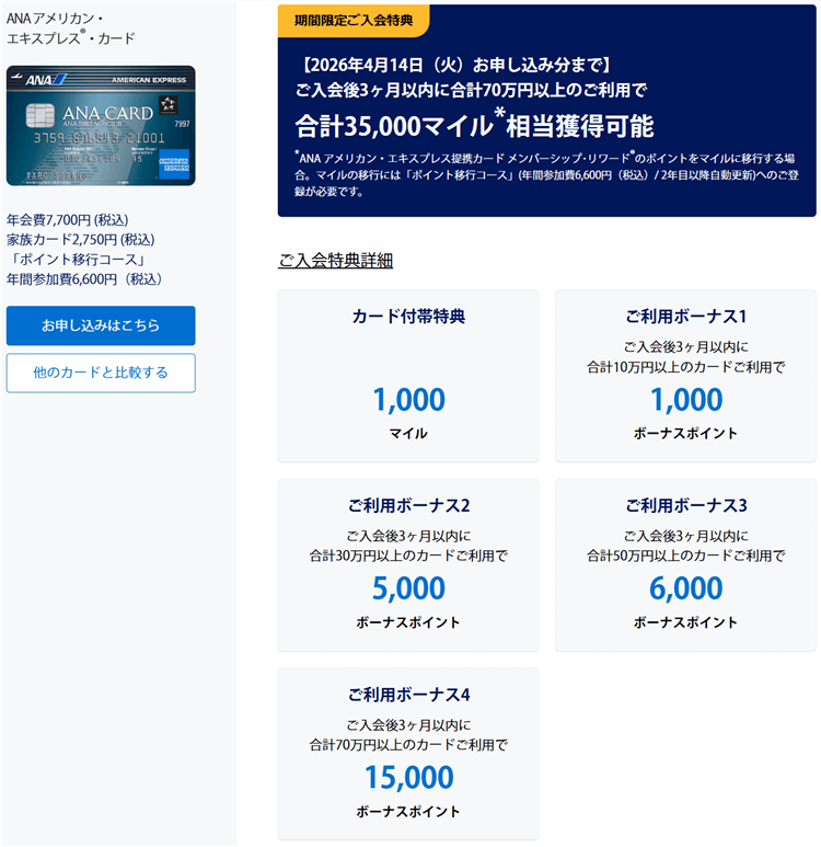 - ANAアメックスカードで最大35,500ANAマイル