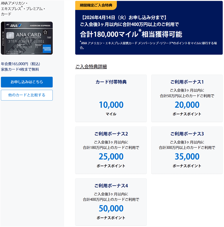 - ANAアメックスプレミアムカードで最大185,500ANAマイル