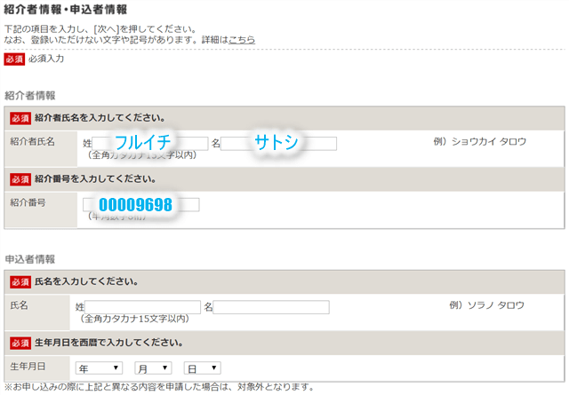そうすると上記のような画面になりますので、紹介者情報の部分に下記の2つを記入してください。