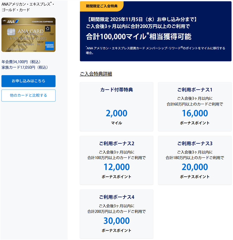 先ほどANAアメックスの項でも紹介しましたが、ANAアメックスゴールドの場合だとこうなります。
