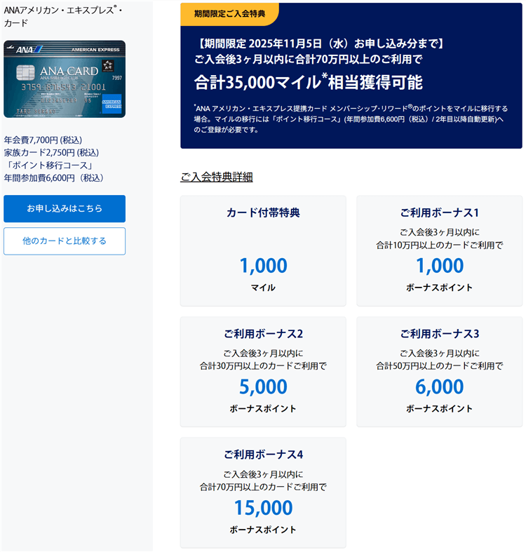 - ANAアメックスカードで最大35,500ANAマイル