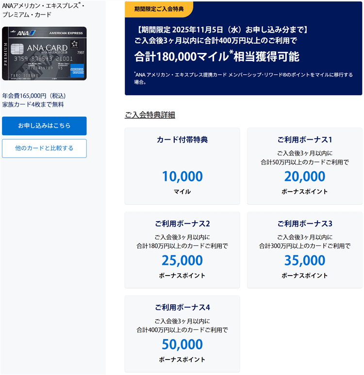 - ANAアメックスプレミアムカードで最大185,500ANAマイル