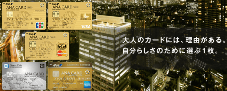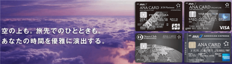 ANA VISA、ANA Master、ANA JCB、ANA VISA Suica、ANA VISA nimoca、ANA TOKYU POINT ClubQ PASMO マスター、ANA To Me CARD PASMO JCB、ANA アメリカン・エキスプレス、ANA ダイナース。
