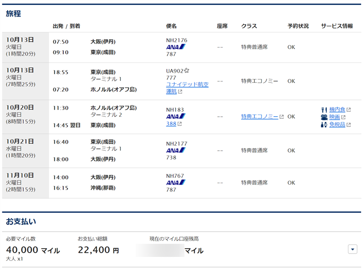 東京-ホノルルの往復で必要なANAマイルはこのようになります。
