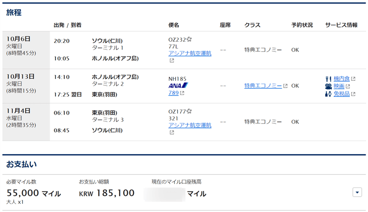 ソウル発券のアシアナ航空でのハワイホノルルに行く方法は通常よりもマイルを多く消費します。