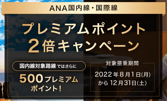 【ANA】2022年プレミアムポイント2倍キャンペーン!2022年12月31日搭乗分まで!!