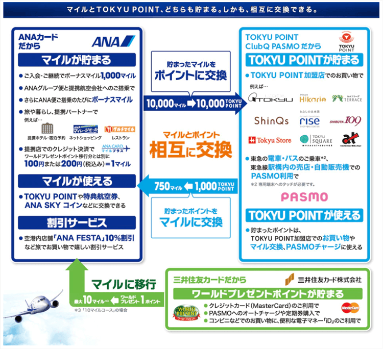 メリットの2つ目は、マイルだけでなくTOKYUポイントやワールドプレゼントポイントが貯まり、かつ相互にポイント交換することができるんです。