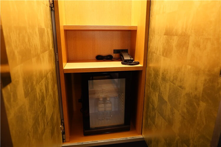 中央には大きなチェストがあり、こちらの扉を開くと電話があり、その下には冷蔵庫があります。