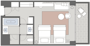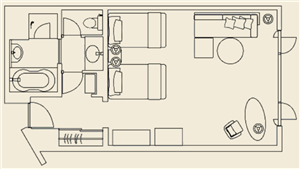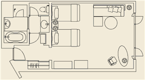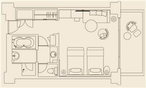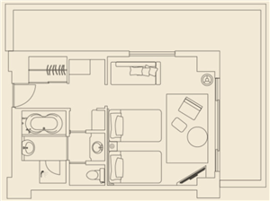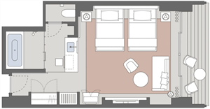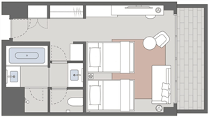 デラックスベイルーム![]() | ベイウィングの4~5階 面積 43.2㎡ ベッドサイズ:1350mm×2030mm×330mm 定員 1~4名 客室数 44室(全室禁煙)・3名様以上の場合、エキストラベットをご利用いただきます。 ・4名様ご利用の場合、お部屋は手狭になります。 |