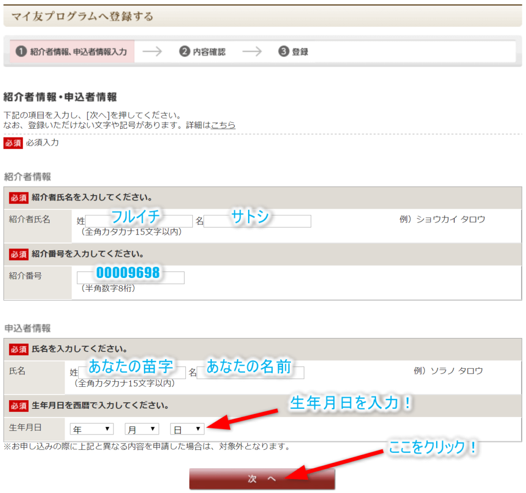 こちらでは紹介者(私)の情報、申込者(あなた)の情報を記入していきましょう。