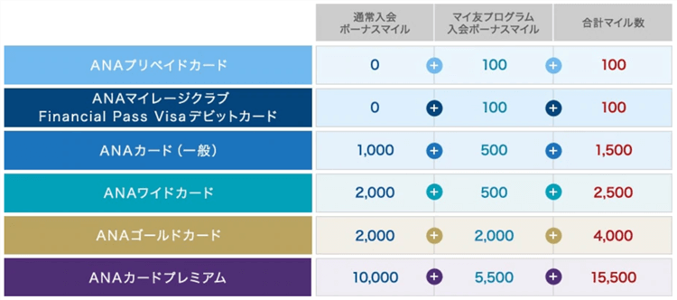 今回紹介しているマイ友プログラムですが、入会するANAカードによって貰えるマイルが変わります。