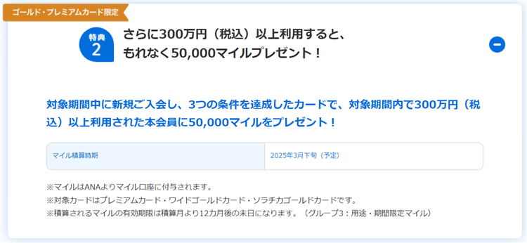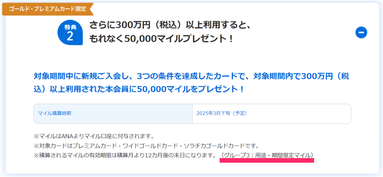 続いてANAJCBゴールド・プレミアムカード限定の300万円利用達成で貰える50,000マイルも先ほどと同様にグループ3:用途・期間限定マイルなので、有効期限は12か月となっています。