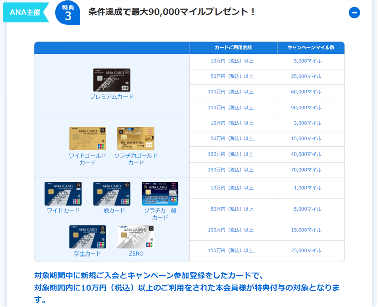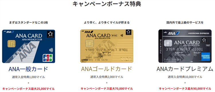 - 入会されるANAカードの種類によって、特典として付与されるマイル数が異なります。