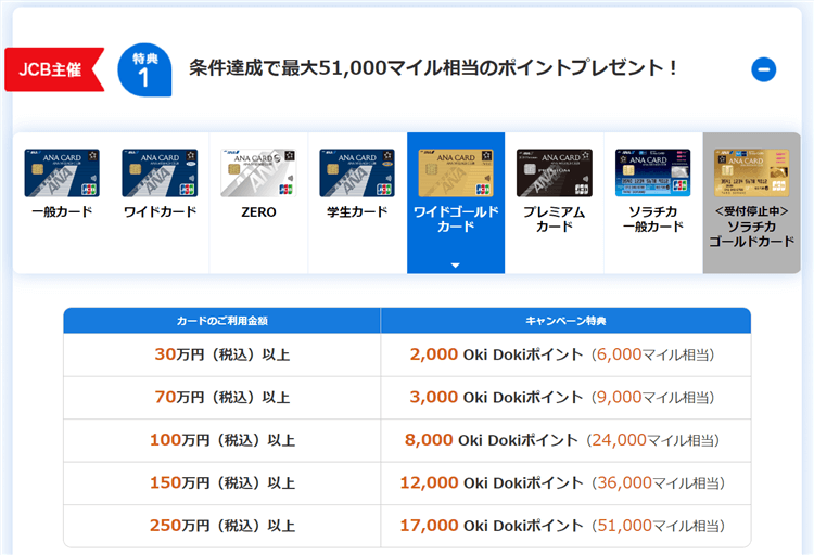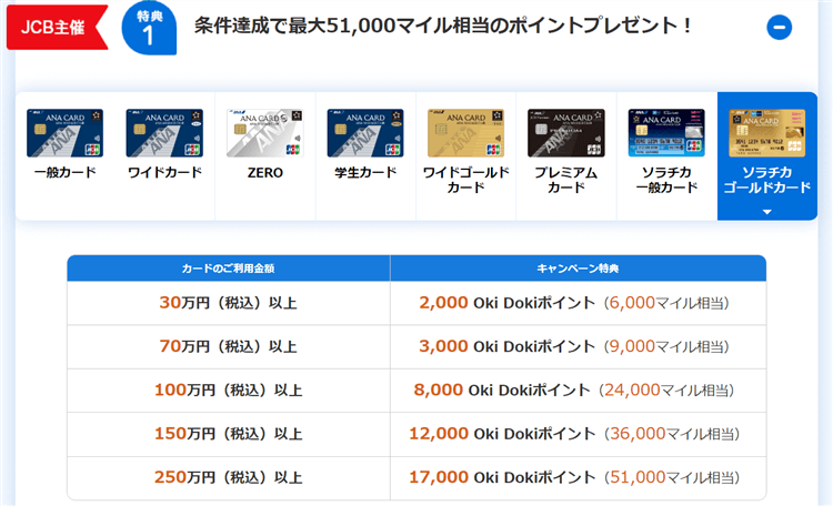 | 100万円(税込)以上 | 4,000 Oki Dokiポイント(12,000マイル相当) | 8,000 Oki Dokiポイント(24,000マイル相当) | 8,000 Oki Dokiポイント(24,000マイル相当) |