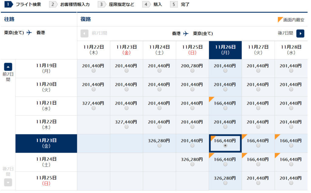 仮に11/23~11/26という日程で家族4人(大人2人、子供2人)香港に旅行に行ったとします。